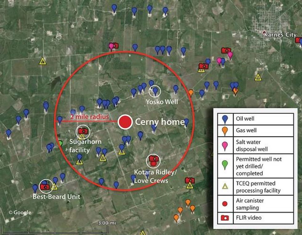 "This crap is killing me and my family," said Mike Cerny, a former oil company truck driver who lives a mile within 17 oil wells. The fumes from the nearby wells make Cerny and his wife "dizzy, irritable and nauseous," while their teenage son suffers from frequent nosebleeds.