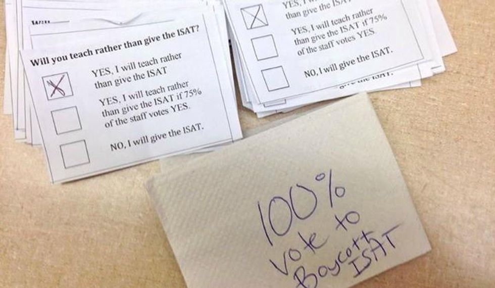 The unanimous "Yes" vote was taken on a paper ballot (see above) that asked the question: "Will You Teach Rather Than Give the ISAT?"