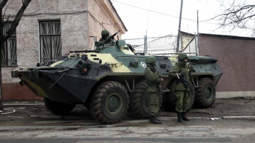Russian armed personnel carriers were parked on street corners throughout the Crimean capital Simferopol. The Russians have since surrounded and taken ground inside Ukrainian military bases throughout the peninsula.
