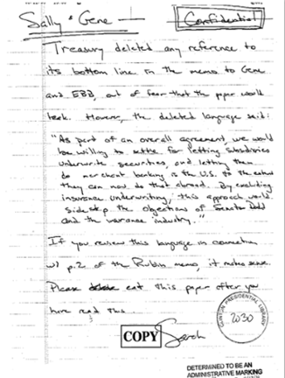 Released by the Clinton Library on Friday as part of a large declassification of presidential documents, Roberts' reporting shows how these specific internal memos reveal how top-level advisers tried to pressure Clinton to follow their advice on Wall Street deregulation. In addition, read carefully, portions of the hand-written notes show the pro-active manner by which the Clinton team kept aspects of their motivations--which included providing preferential treatment to large financial firms like Citigroup--out of the public record.