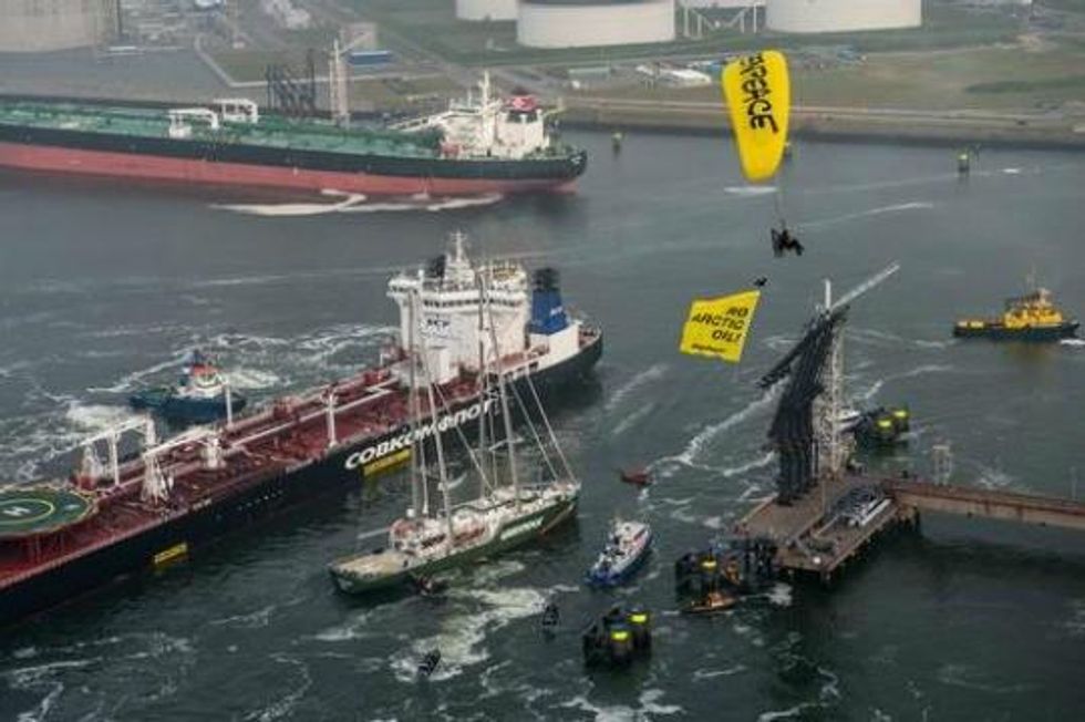 Fulfilling their promise to confront and attempt to stop a Russian oil company's first shipment of arctic oil from reaching mainland Europe, more than 80 activists from Greenpeace on Thursday attempted to block the oil tanker Mikhail Ulyanov from docking in the Dutch port city of Rotterdam.