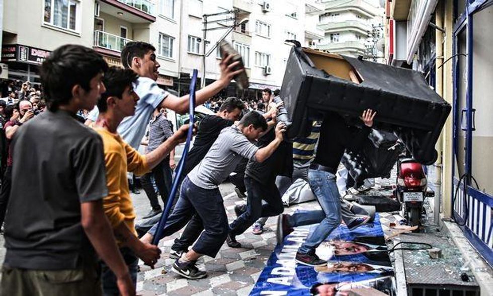 Locals complained about haphazard practices at the mine, whose owners are linked to Erdogan's governing Justice and Development party (AKP), and skirmishes broke out between youths and police outside the local AKP office.Tensions were high as hundreds of relatives and miners gathered outside the mine, waiting for news. Women wailed in grief as others shouted angrily at local authorites, and riot police with gas masks and water cannon stood by.