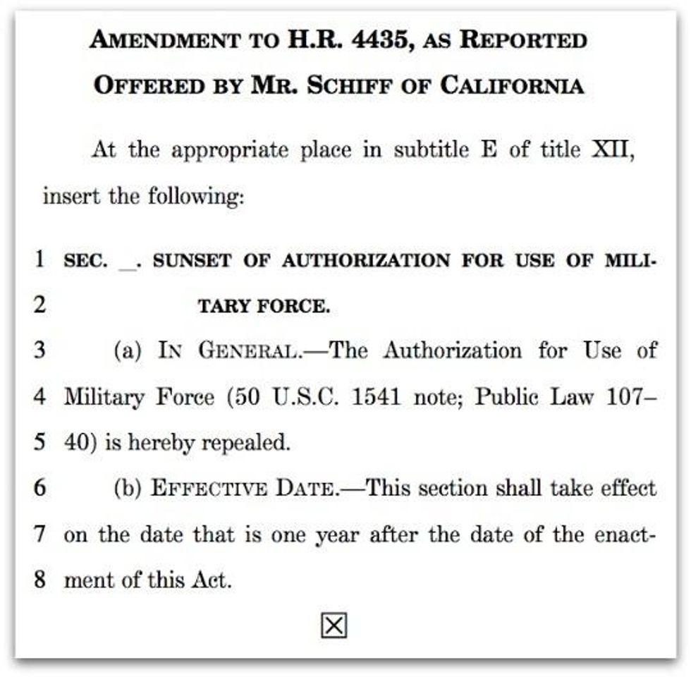 Introduced for debate as part of this year's National Defense Authorization Act (NDAA), now passing through the house, the amendment (pdf) by Rep. Adam Schiff (D-Calif.) is only eight lines long and looks like this: