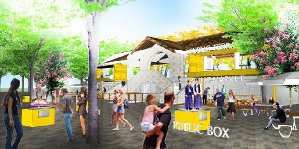 In one proposal, participants plan to design a "public terrace" for recent immigrants, located in Columbus Park, which has historically been a gathering place for new arrivals to the country. The design would include a "History Box," which designers Gentaro Matsubara, Shingo Sekiya, and Jeon Young-mi describe as a "communication tool to learn about the history of the site about immigrants that used to live and work near around Columbus Park."