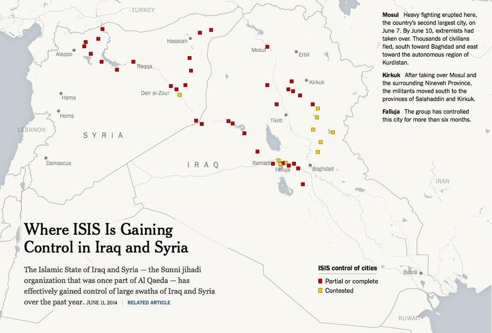 The New York Times provided this map to show the regions where ISIL militants have been able to gain territory over the last several days in addition to areas they've held for months: