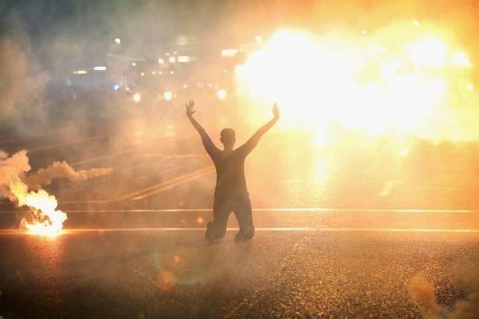 Harrowing images and videos from Ferguson's ongoing protests showed tense days turning into chaotic nights as police forces descended on the demonstrations, dressed in army camouflage and black helmets, wielding attack dogs and assault rifles, straddling armored tanks. They arrested reporters, refused to answer questions, and confiscated and dismantled news cameras. They fired tear gas canisters and rubber bullets at groups of protesters, eerily backlit by sporadic street-lamps and tank headlights. The smoke grenades sent heavy, billowing clouds through crowds of people who recoiled from the gas and held their empty arms in the air with the simple, pleading message, "Don't shoot."