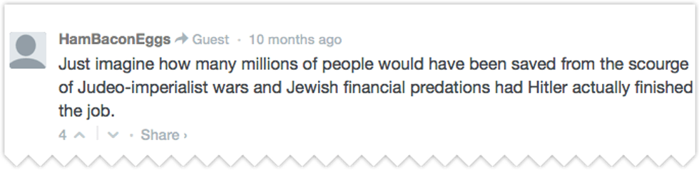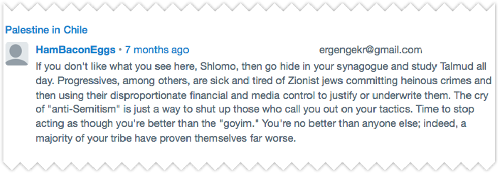 But on Common Dreams, DeShawn S. Williams was only one among dozens of screen-name characters this poster created. They seemed to be in competition to revile Jews. Here's how "HamBaconEggs," the site's most prolific anti-Semitic persona, began a conversation last October: