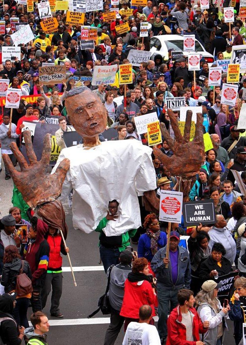 Part of a four-day convergence that organizers have called Ferguson October, the afternoon march brought forth a mix of messages that hinged on the racial politics of policing that have been exposed in a series of high-profile and shocking examples in recent months, with the case in Ferguson being only the most well-known.