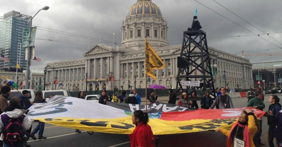 More than 150 protesters on Friday blockaded the California State Office Building in downtown San Francisco and erected a 16-foot fracking well in the middle of an intersection to demand Governor Jerry Brown cease all drilling and fossil fuel extraction and respect climate justice.
