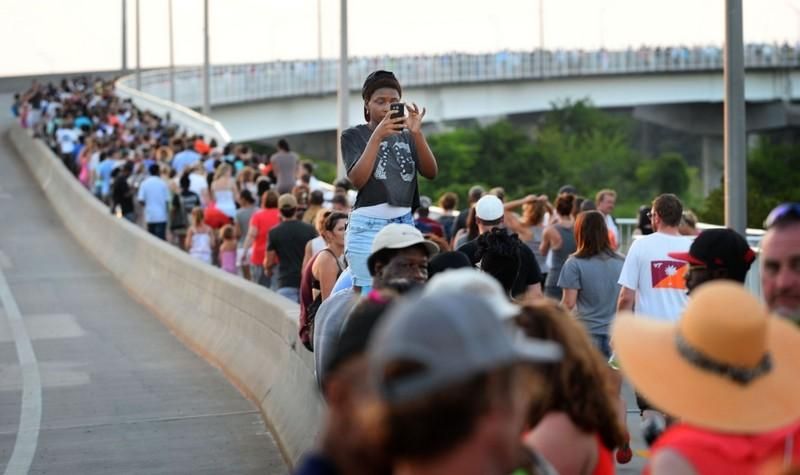 As many as twenty thousand people came together on a bridge in Charleston, South Carolina on Sunday evening, marching in the name of love and unity against the racist violence that took the lives of nine people last week in a historic black church.