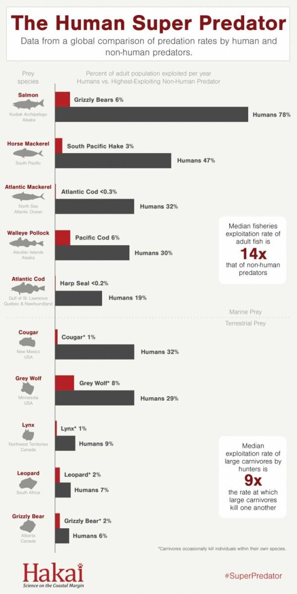 "Our wickedly efficient killing technology, global economic systems, and resource management that prioritizes short-term benefits to humanity have given rise to the era of the human super predator," stated Dr. Chris Darimont, science director for Raincoast and Hakai-Raincoast professor at the UVic. "Our impacts are as extreme as our behavior as predators, and increasingly, humanity bears the burden of our predatory dominance."