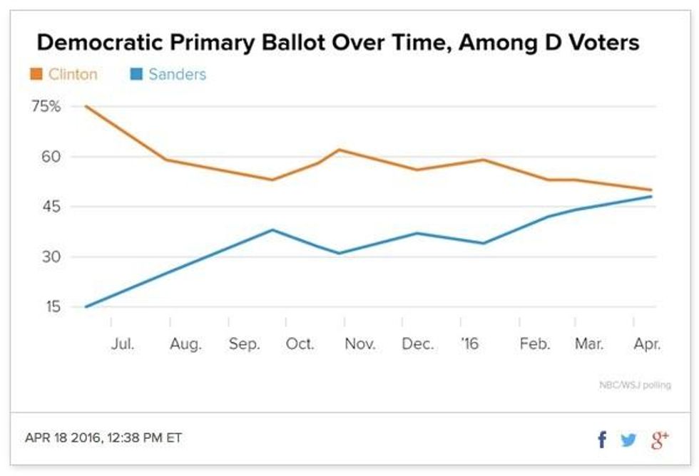 As the Journal reports, "The result continues a steady narrowing of the gap between the two Democratic candidates since January, when Mrs. Clinton led by 25 points, 59% to 34%. And it is a far cry from the way the race looked when Mr. Sanders began his campaign last year: In June 2015, a Journal/NBC poll found Mrs. Clinton leading by 60 percentage points, 75% to 15%."
