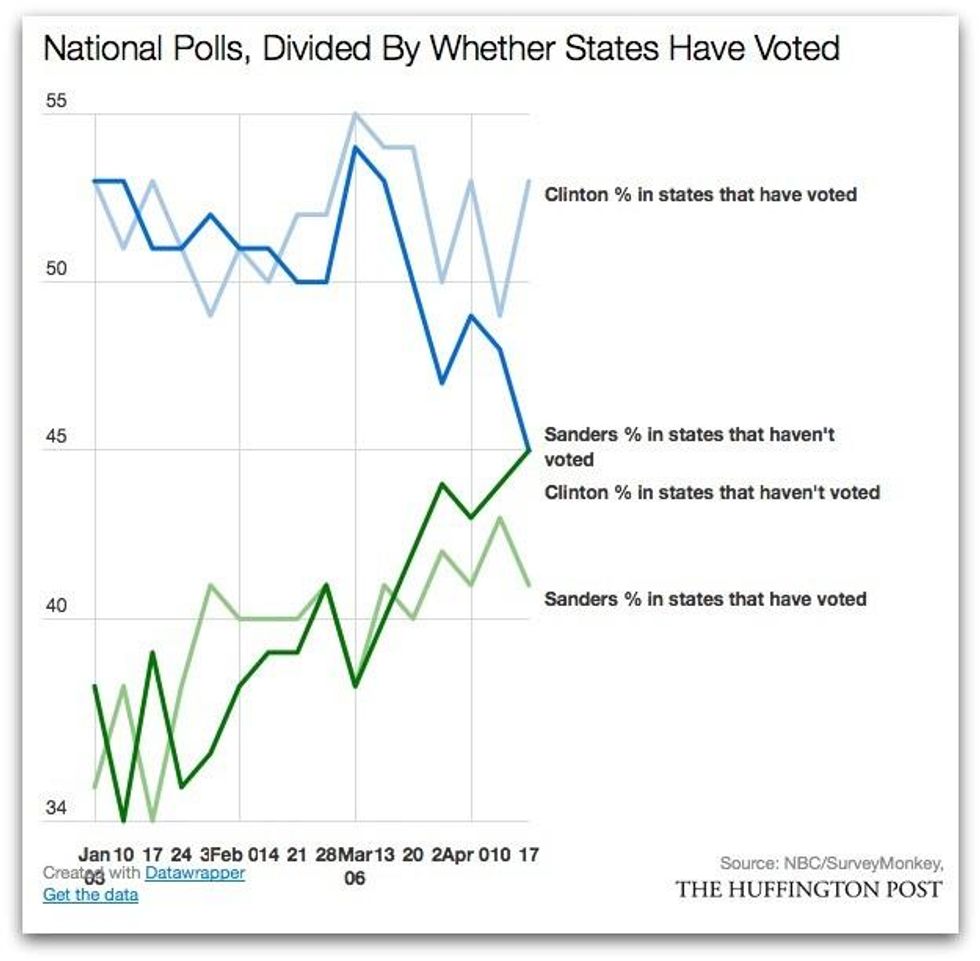 While a mainstream media narrative has continued to discount Sanders' ability to surpass Clinton in pledged delegates prior to July's convention in Philadelphia, an analysis of poll averages by the Huffington Post on Saturday showed that support for Sanders nationally has virtually wiped away Clinton's once substantial lead. Those gains are particularly striking, as the reporting emphasizes and the following graph shows, in states that have yet to vote: