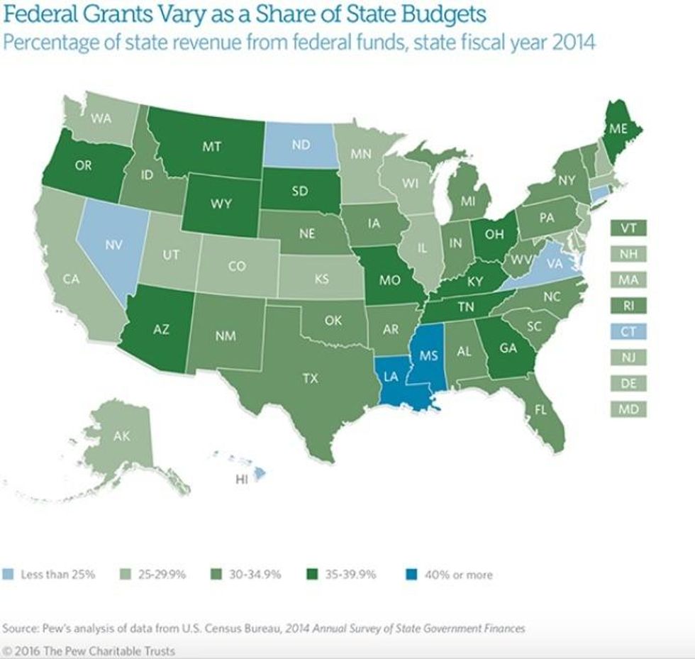 According to an analysis by The Hill reporter Reid Wilson of new data (pdf) published by Pew Charitable Trusts on Monday, "the average state that voted against [President Barack] Obama twice relied on federal funding for an average of 33.8 percent of itsbudget." In contrast, "Among the 27 states that voted for Obama twice, federal grants made up 29.9 percent of the average state budget."