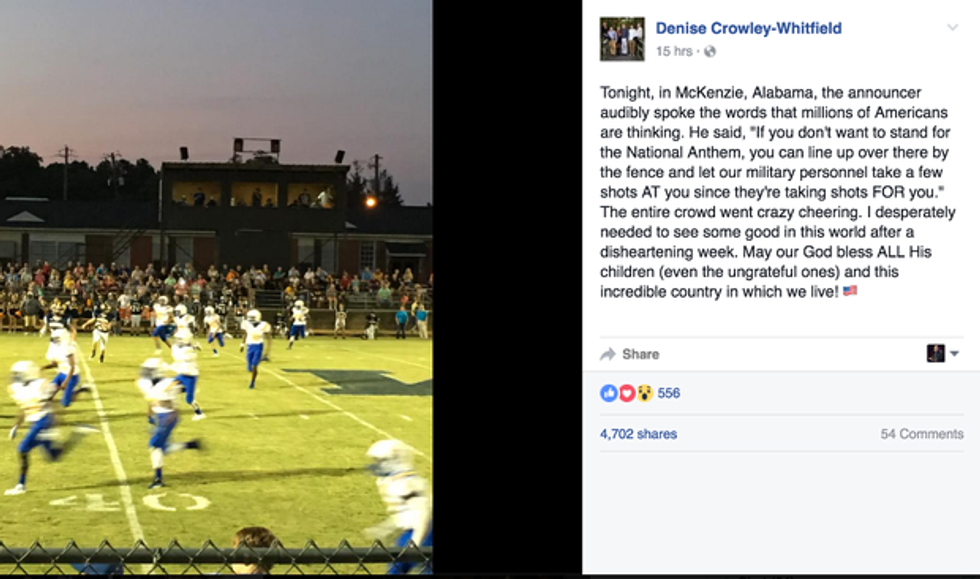 "If you don't want to stand for the national anthem, you can line up over there by the fence and let our military personnel take a few shots at you since they're taking shots for you," the announcer said at the game versus Houston County High School, according to Facebook poster Denise Crowley-Whitfield.