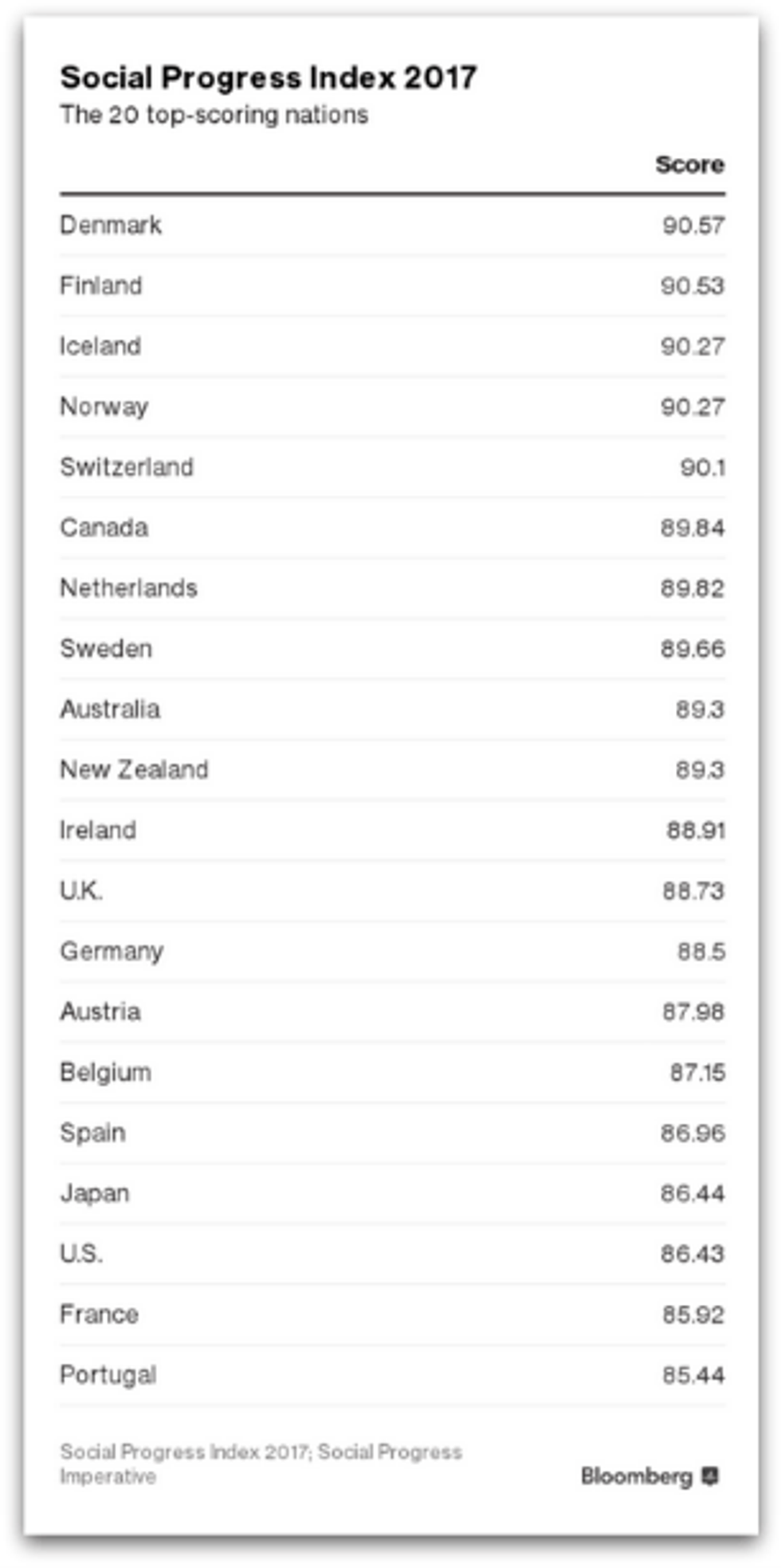 Released by the Social Progressive Imperative (SPI), the 2017 Global Social Progress Index reveals that the U.S. ranks 17th in the world when it comes to promoting the general welfare, coming in behind its Canadian neighbor to the north and far behind Scandinavian countries and the other social democracies of Europe. Of all countries, Denmark comes in first when it comes to providing for its citizens and fostering progress on various fronts.