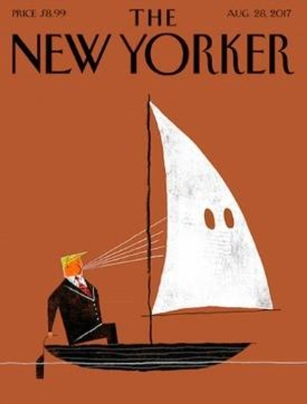 The New Yorker cover, illustrated by artist David Plunkert and titled "Blowhard," shows Trump providing the wind for a sail shaped like a Klu Klux Klan hood.