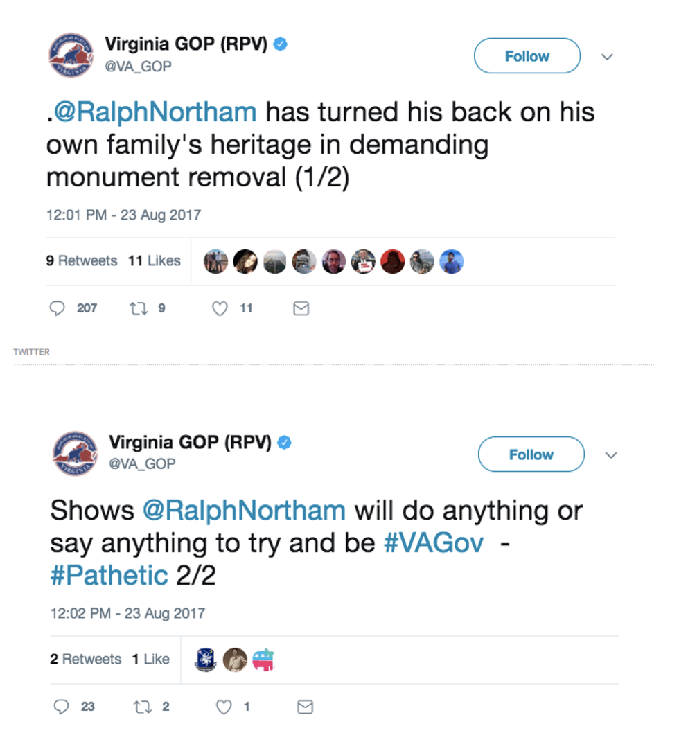 Virginia's Republican Party was under fire Thursday after posting on its official Twitter account an accusation that Democratic gubernatorial nominee Ralph Northam had "turned his back" on his heritage by supporting the removal of Confederate monuments.