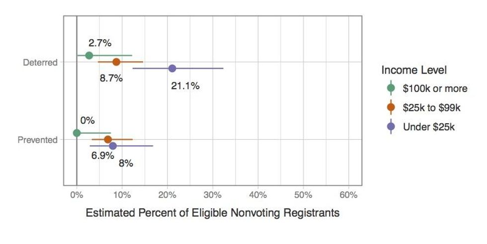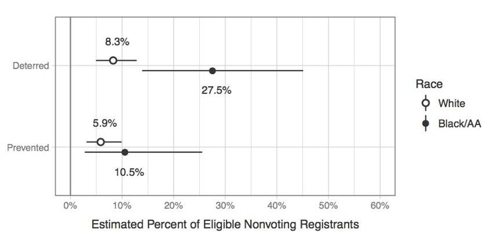 The study also found socioeconomic and racial disparities among those impacted by the new law. "The burdens of voter ID fell disproportionately on low-income and minority populations," writes Mayer. More than 20 percent of registrants coming from homes with incomes less than $25,000 say they were kept from voting by the law; 8.3 percent of white voters surveyed were deterred, compared with 27.5 percent of African Americans.