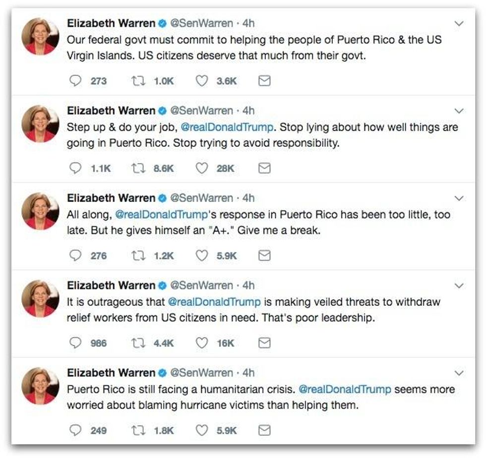 In one out of a series of tweets, Warren said, "It is outrageous that @realDonaldTrump is making veiled threats to withdraw relief workers from US citizens in need. That's poor leadership."