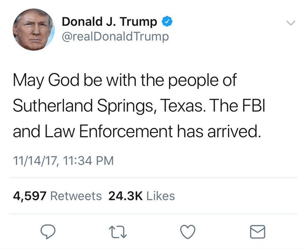 \u201cTrump just tweeted again about the church shooting in Sutherland Springs. The 1st tweet was the day of the event, 9 days ago. Is this his shooting tweet template? He forgot to change the location to today's shooting: California.\u201d— Shannon Ritenour (@Shannon Ritenour) 1510721792