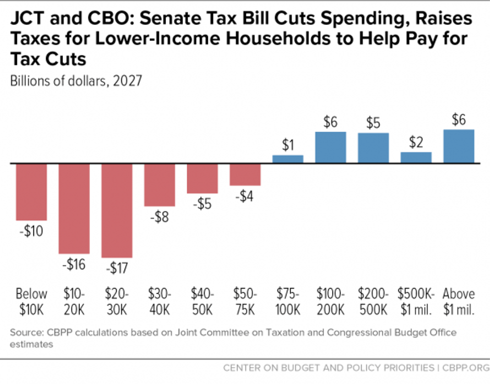 "Overall, in 2027--when only the corporate tax cuts, slower inflation measure, and individual mandate repeal would remain in place--the Senate bill would, on average, raise taxes or reduce federal expenditures for households with incomes below $75,000 by about $60 billion--while still giving large tax reductions (through its corporate tax cuts) to those at the top," noted CBPP's Chuck Marr.
