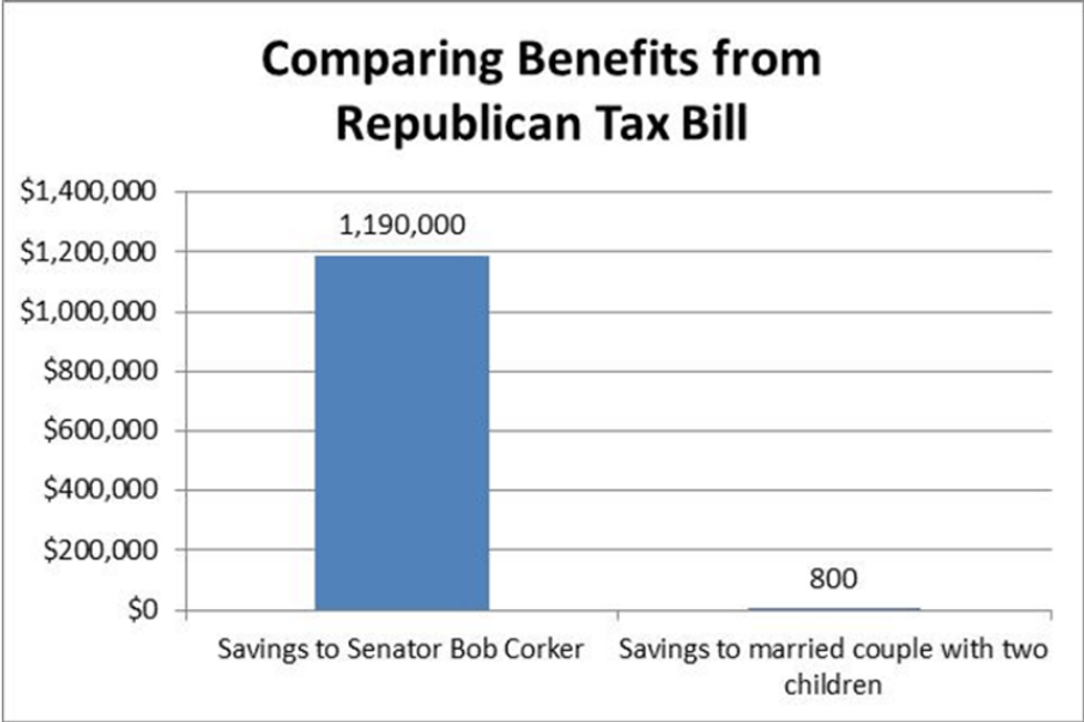 These savings serve as a marked contrast to the benefits that would be seen by low-income families as a result of the highly-touted child tax credit changes demanded by Sen. Marco Rubio (R-Fla.) in exchange for his vote, Baker goes on to observe. While Corker, one of the wealthiest members of Congress, could potentially see a million-dollar annual benefit from the GOP tax plan, a married couple with two children earning $30,000 a year would only get an extra $800 from Rubio's tax credit efforts.