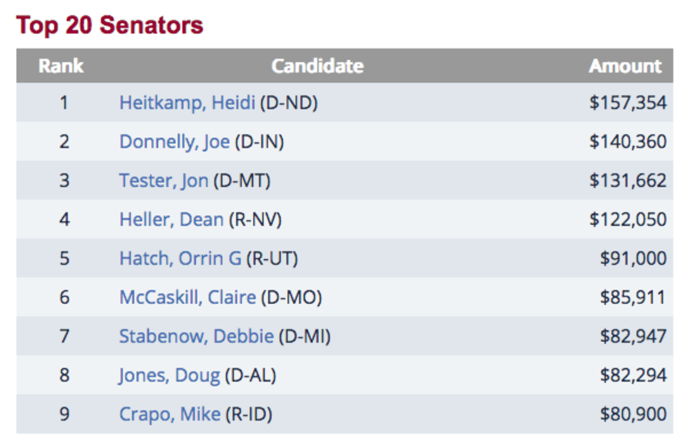 According to the Center for Responsive Politics, Sens. Heidi Heitkamp (D-N.D.), Joe Donnelly (D-Ind.), and Jon Tester (D-Mont.)--all of whom are co-sponsoring Crapo's bill--are the top three recipients of commerical bank cash this election cycle.