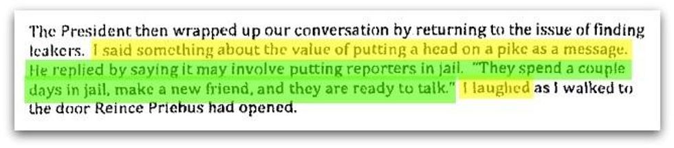 Amid more salacious talk and other key interactions--including discussions of "golden showers"; how President Trump claimed Russian President Vladimir Putin bragged to him that Russia had the "most beautiful hookers in the world"; and a request by the president for the then FBI director to "let go" of the investigation into national security advisor Michael Flynn--a revealing moment contained in the contemporaneous memos of James Comey, redacted versions of which were released Thursday night, is when Trump suggests jailing journalists and then having them sexually assaulted as way to force them to "talk" about their sources.