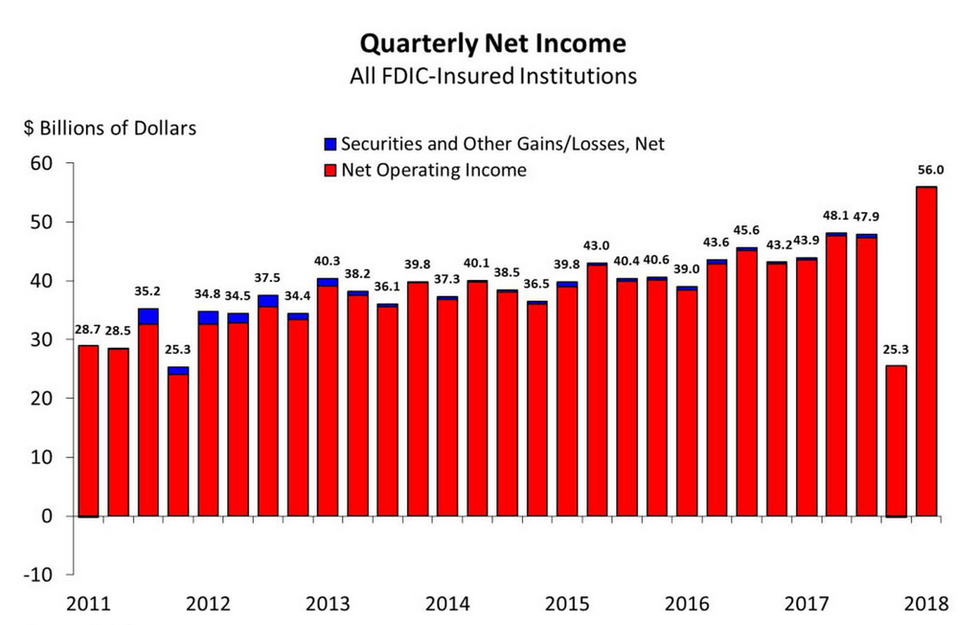 As America's largest corporations continue their unprecedented stock buyback spree in the wake of President Donald Trump's $1.5 trillion tax cut, new government data published on Tuesday showed that U.S. banks are also smashing records thanks to the GOP tax law, raking in $56 billion in net profits during the first quarter of 2018--an all-time high.