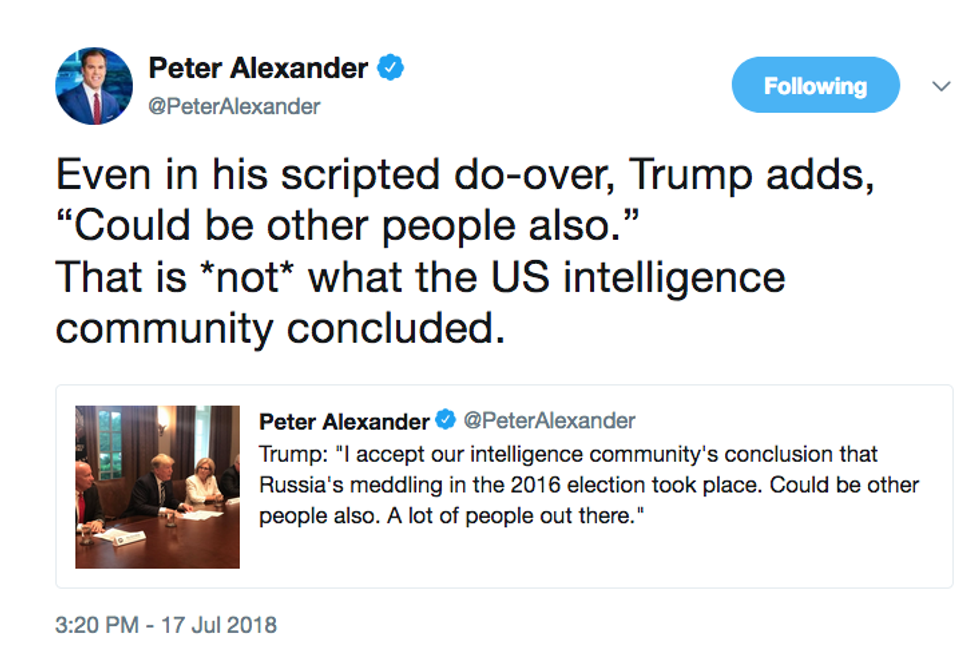 After insisting that he accepts "our intelligence community's conclusion that Russia's meddling in the 2016 election took place," Trump added: "Could be other people also. A lot of people out there."