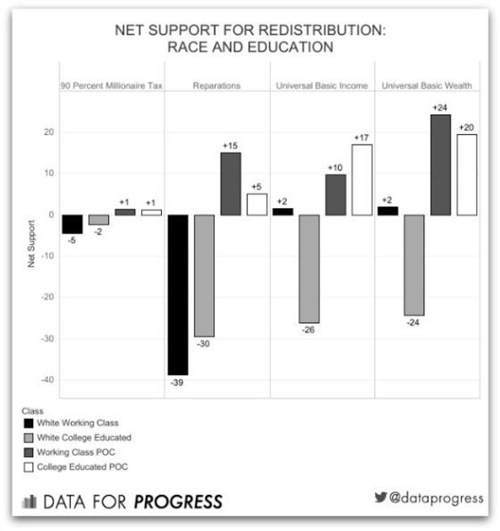 Other policies DFP examined--such as a universal basic income and a 90 percent millionaire tax--were viewed less favorably across the board, but still attracted support from working class voters.