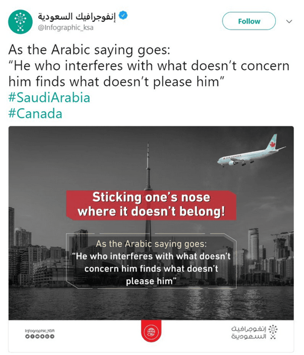 As tensions between Saudi Arabia and Canada continue to soar after the Canadian Foreign Ministry dared to condemn the kingdom's imprisonment of dissidents and human rights activists, a verified Twitter account connected to the Saudi government tweeted a graphic on Monday that appeared to threaten Toronto with a 9/11-style attack.