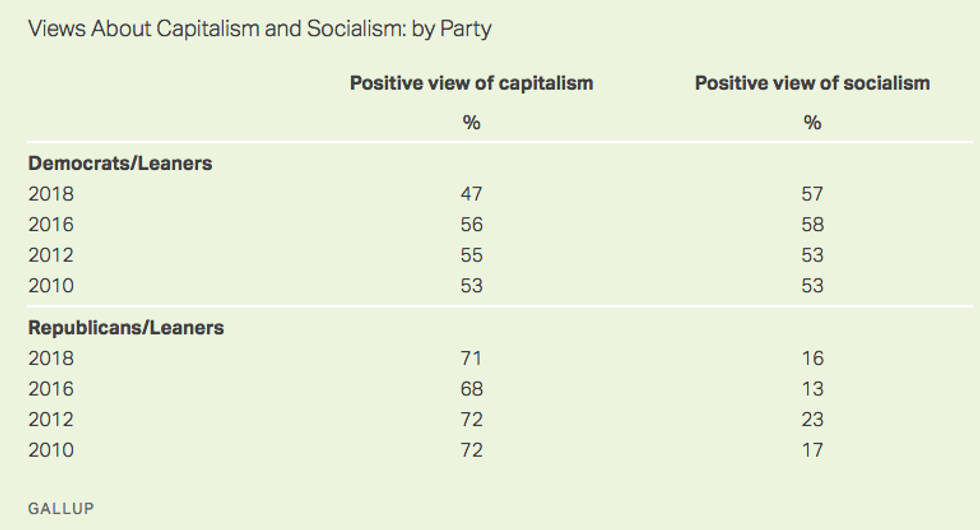 "Attitudes toward socialism among Democrats have not changed materially since 2010, with 57 percent today having a positive view. The major change among Democrats has been a less upbeat attitude toward capitalism, dropping to 47 percent positive this year--lower than in any of the three previous measures."