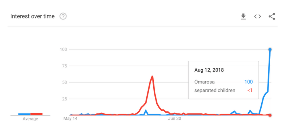 Legum goes on to point to a Google Trends chart showing levels of interest in the children separated from their parents by the Trump administration's so-called zero tolerance policy--which a 99-year-old Nuremberg prosecutor called "a crime against humanity"--compared to interest in the Omarosa story.