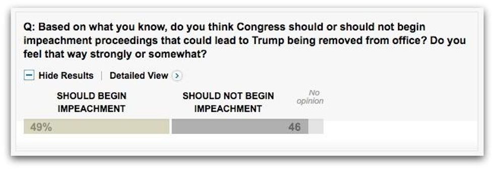 The new Washington Post/ABC News survey found that while 60 percent of respondents disapprove of his job performance, compared to just 36 percent who approve, the idea that Congress should officially investigate the possibility that Trump has committed "high crimes and misdemeanors" now enjoys a plurality if not quite a majority.