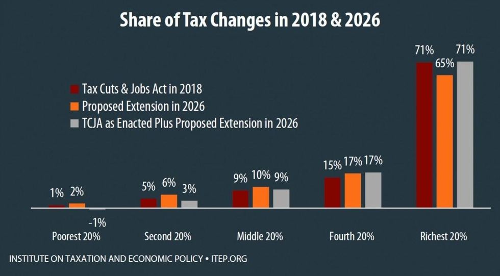 "Extending the cuts to individual tax rates isn't a win for middle-class Americans. Congressional Republicans are dropping a few crumbs in front of the American public to distract from the fact that they're robbing them blind," the Patriotic Millionaires declared in a statement on Tuesday. "Just wait, Republicans are going to use these cuts later as an excuse to cut Medicare, Medicaid, Social Security, and other programs millions of Americans rely on."