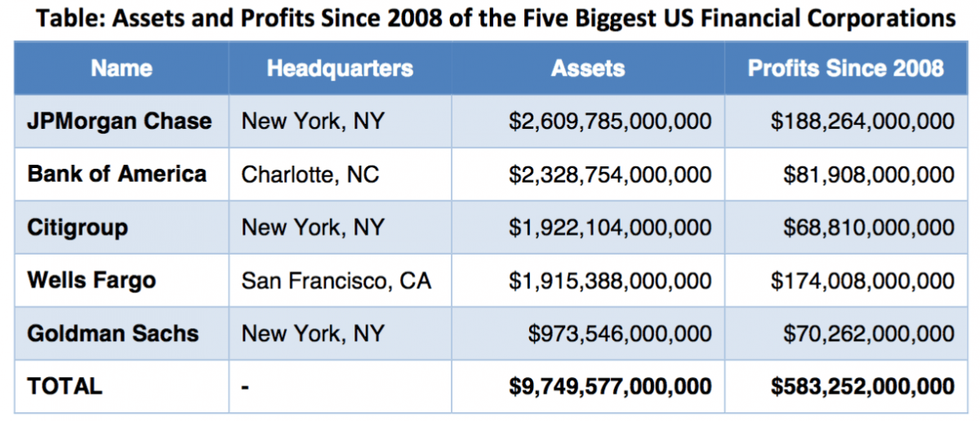 --Bartlett Naylor, Public CitizenThanks to the Obama administration's decision to rescue collapsing Wall Street banks with taxpayer cash and the Trump administration's massive tax cuts and deregulatory push, America's five largest banks--JPMorgan Chase, Bank of America, Citigroup, Wells Fargo, and Goldman Sachs--have raked in more than $583 billion in combined profits over the past decade, Public Citizen found in its analysis marking the ten-year anniversary of the crisis.