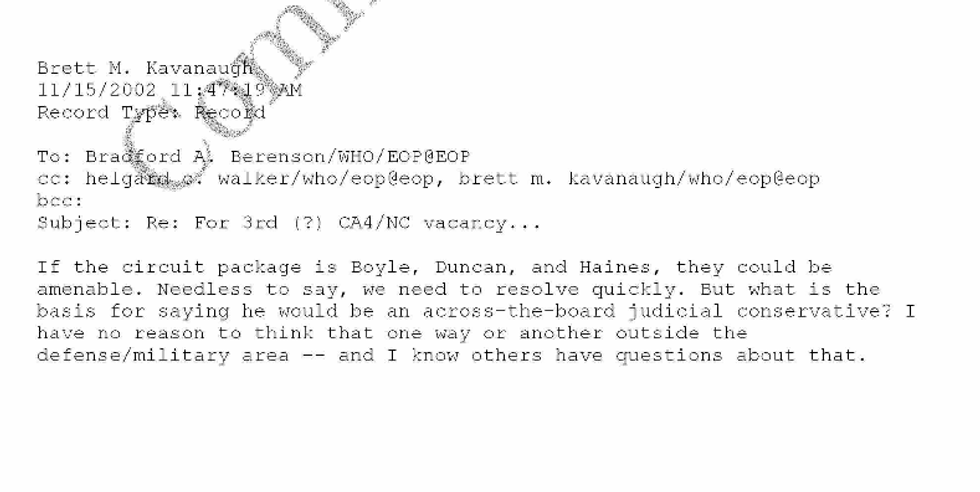 In an email dated November 15, 2002, Kavanaugh asked other White House officials whether Haynes, who helped form the Bush administration's torture policy while working as general counsel for the Pentagon, would be a sufficiently conservative judge.