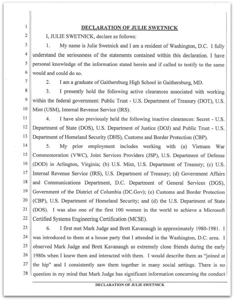 In her sworn statement, Swetnick says that she "fully understands the seriousness" of her accusations and charges that she was "gang raped" when she was a high school student at a party and that Kavanaugh, and his friend Mark Judge, were both "present."