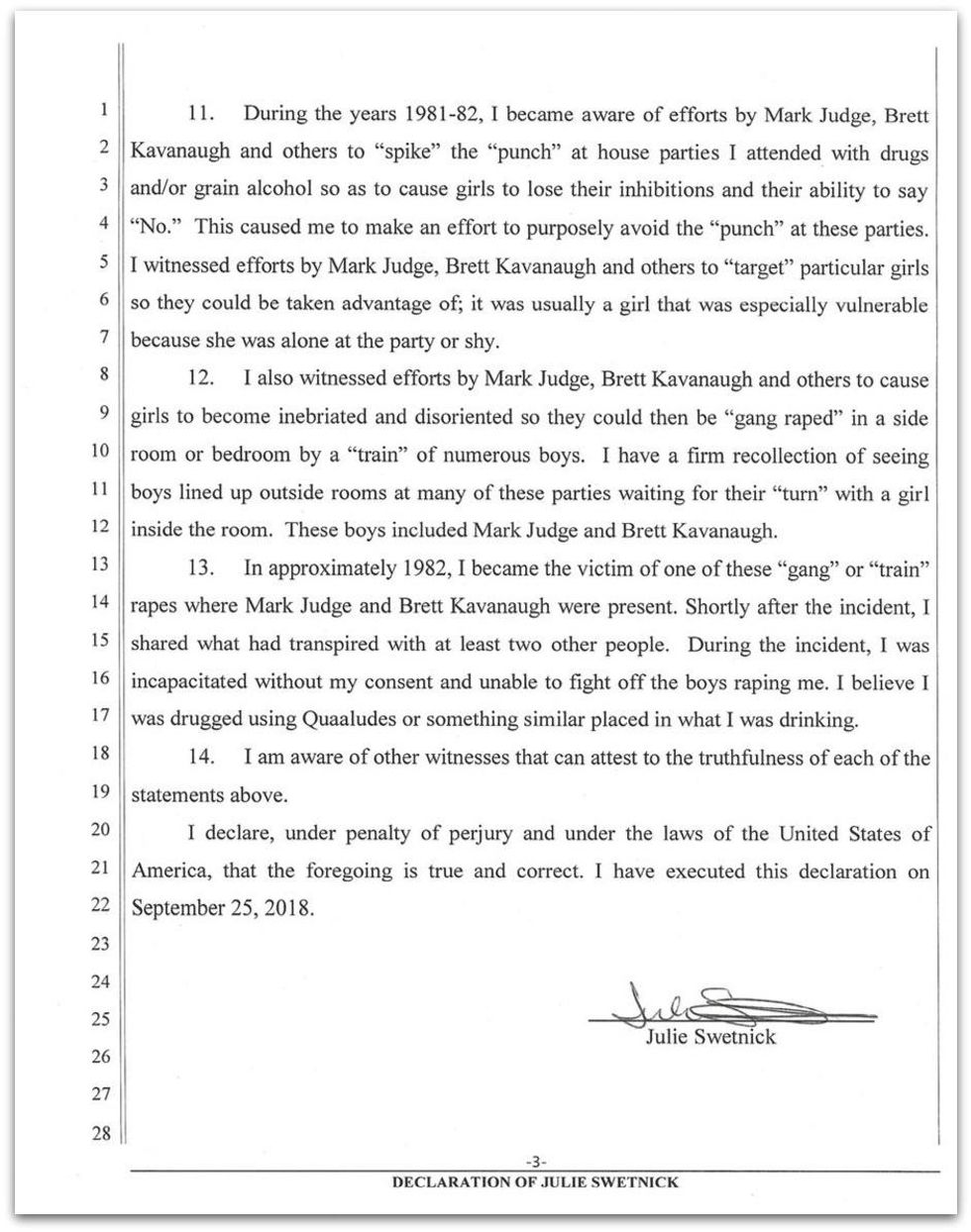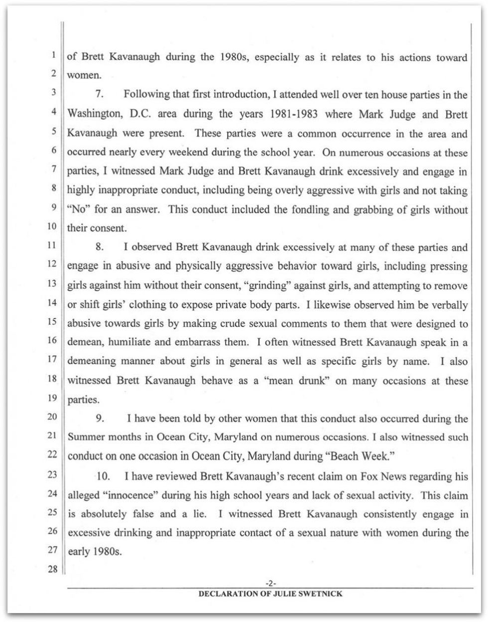 She also says she that Kavanaugh and his friends were known at the time for "targeting" girls with alcohol and drugs in order to take advantage of them sexually, and that she has "a firm recollection" that Judge and Kavanaugh were among the "boys lined up outside rooms at many [other] parties waiting for their 'turn' with a girl inside the room."