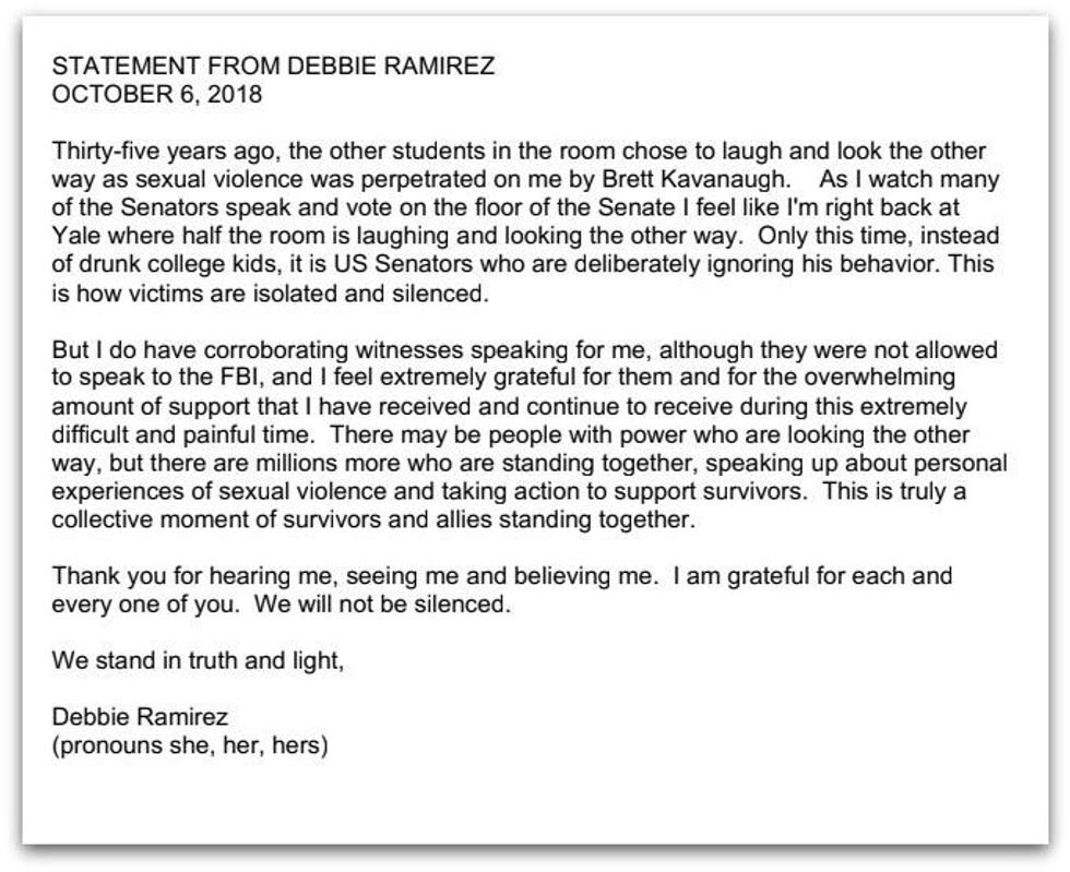 With a public statement issued on Saturday just ahead of Brett Kavanaugh's confirmation vote in the U.S. Senate, Debbie Ramirez--the Yale classmate of the nominee who says he sexually assaulted her while in college--said that even though coming forward has been a painful experience she thanked those who have stood by her side and said the courage of all those survivors is proof that something historic has taken place.
