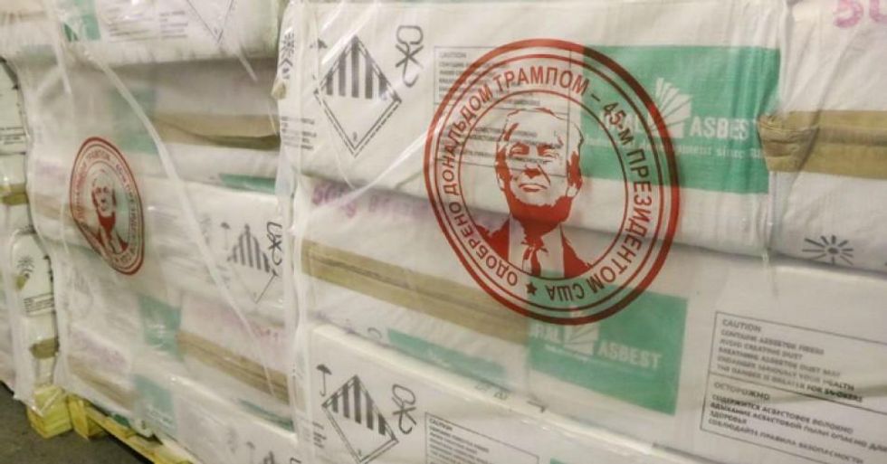 "Donald is on our side!" Uralasbest--Russia's largest asbestos producer--declared in a July Facebook post, which was accompanied by photos showing pallets of asbestos products with Trump's face stamped on the packaging as a seal of approval.