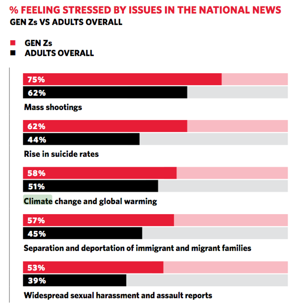 "Specifically, 75 percent of Gen Z members said that mass shootings are a significant source of stress," the APA notes. "Gen Z members are also more stressed than adults overall about other issues in the news, such as the separation and deportation of immigrant and migrant families (57 percent of Gen Z vs. 45 percent of all adults reported the issue is a significant source of stress), and sexual harassment and assault reports (53 percent vs. 39 percent)."