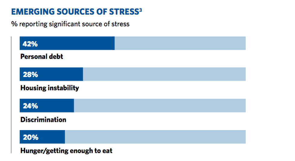 Personal debt, housing instability, discrimination, and hunger were among the specific sources of stress reported by a sizeable percentage of Americans.