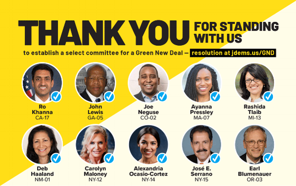 "Through their efforts, 10 congresspeople now back Ocasio-Cortez' Select Committee for a Green New Deal," 350.org, which helped organized Tuesday's planned demonstrations, said in a statement. "Now, youth are taking action in their districts to pressure federal policymakers to back the only rational response to the climate crisis--a massive economic mobilization over the next decade to get our country off fossil fuels."
