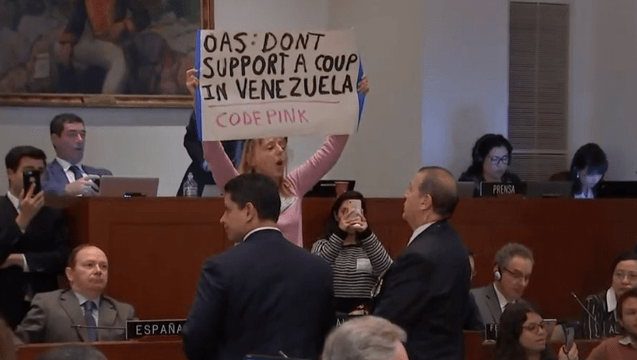Human rights activist and CodePink co-founder Medea Benjamin on Thursday interrupted a meeting of the Organization of American States (OAS) in Washington, DC as she spoke out against the coup attempt being orchestrated by Secretary of State Mike Pompeo and other anti-democratic forces. (Photo: Screenshot/Twitpic/@dancohen3000)