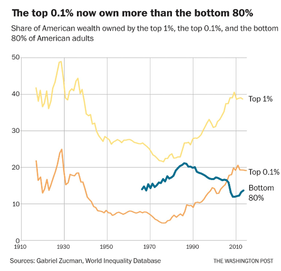 As the Washington Post's Christopher Ingraham noted in a breakdown of Zucman's research, adults in the bottom 60 percent of the wealth distribution "saw their share of the nation's wealth fall from 5.7 percent in 1987 to 2.1 percent in 2014."