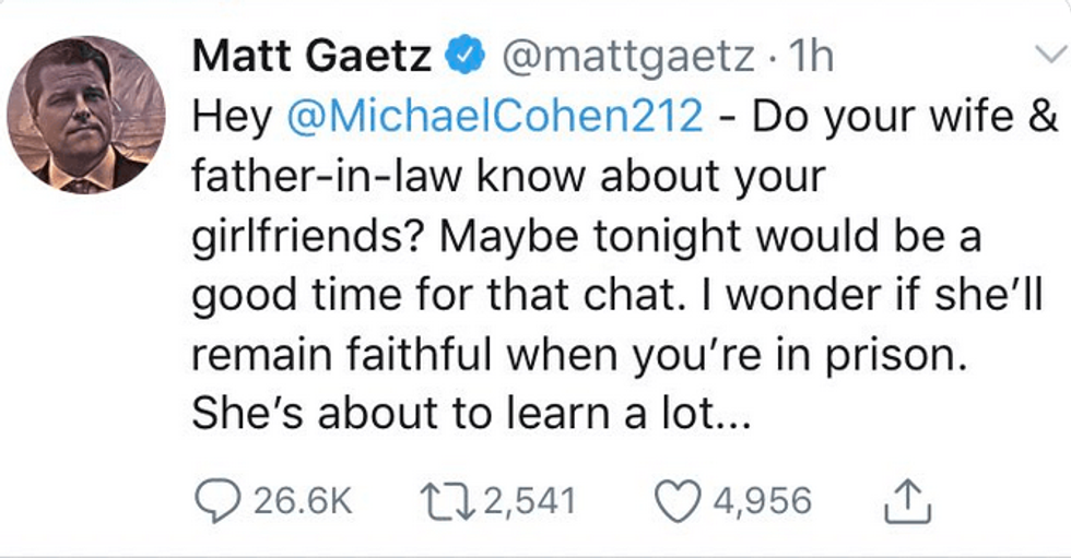 While Gaetz later apologized for and deleted the offending tweet--insisting that it was "not [his] intent to threaten" Cohen--legal analysts were quick to describe the congressman's question as a cut-and-dry case of witness tampering and intimidation.
