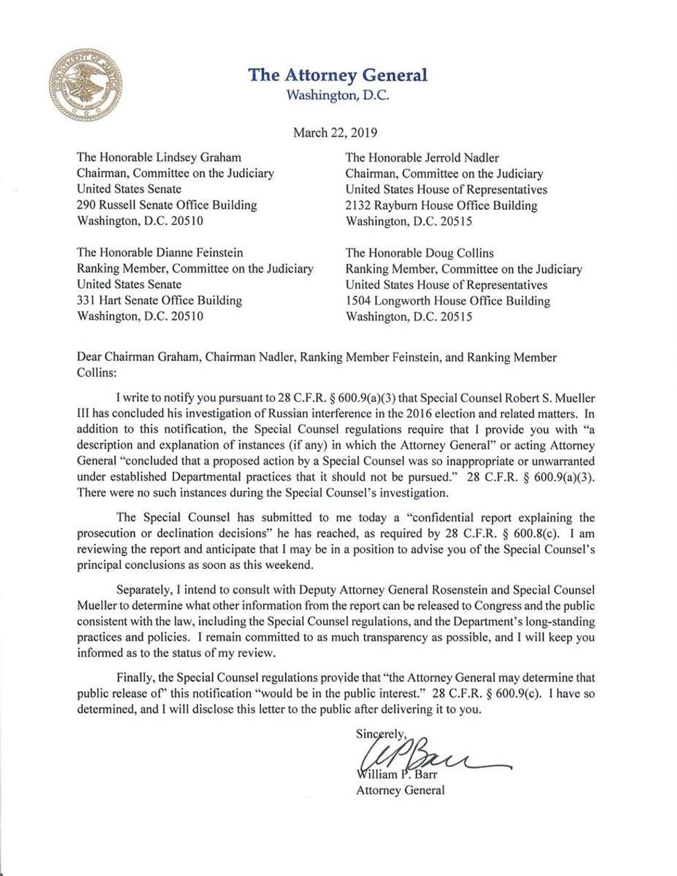 In a letter sent to top members of the House and Senate Judiciary Committees just after 5 PM eastern, Barr confirmed that Mueller had "concluded his investigation of Russian interference in the 2016 election and related matters" and that he would follow, possibly within hours or days, with additional information. "I am reviewing the report," Barr said in the letter, "and anticipate that I may be in a position to advise you of the special counsel's principal conclusions as soon as this weekend."